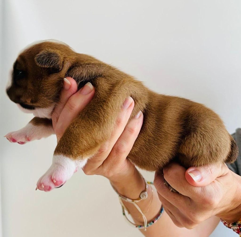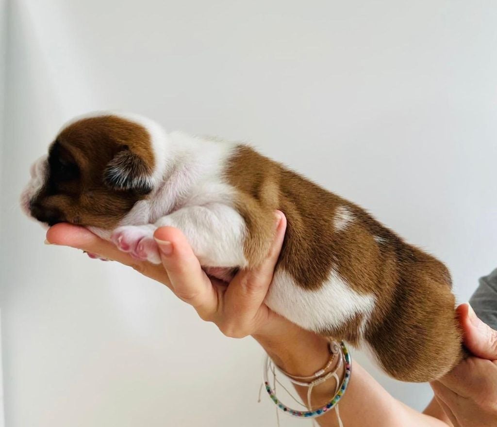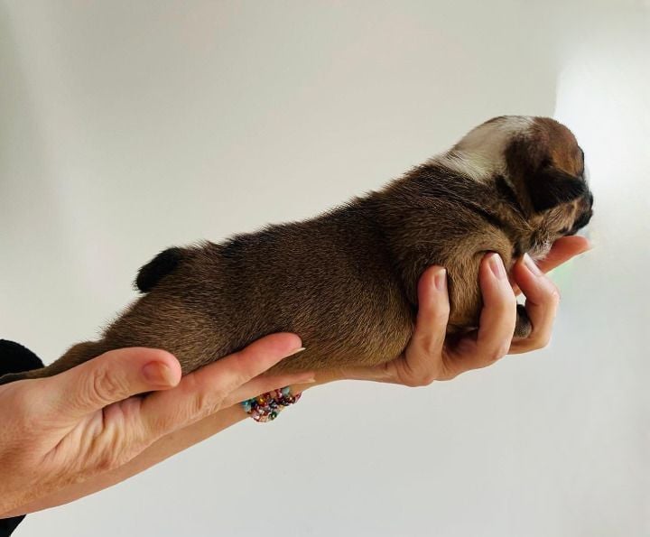 Splendide mâle , fauve, panaché blanc , avec queue au standard. Photo prise au 15ème jour.
